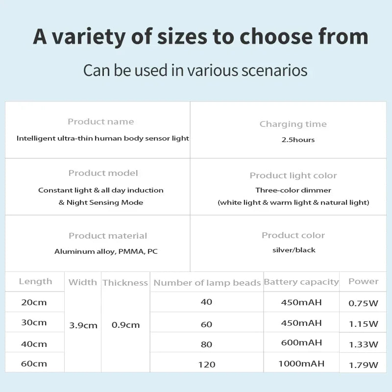10-60cm LED Under Cabinet Lights Wireless Motion Sensor Night Light Ultra Thin Light for Kitchen Bedroom Closet Cabinet Lighting