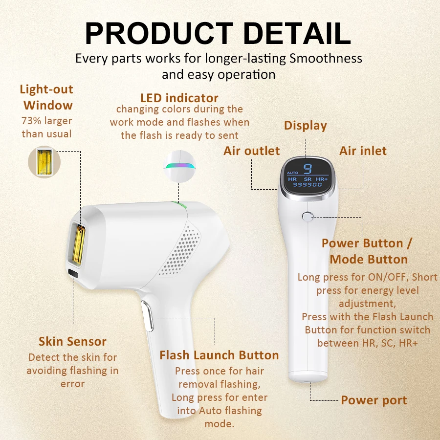 6. 999,900 Flashes for hair removal or hair removal enhanced mode, 999,900 flashes for rejuvenation mode, ensuring a tailored experience for everyone.